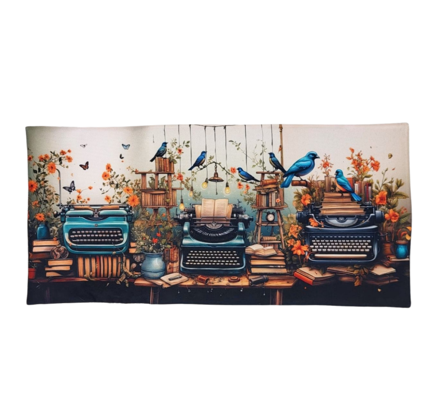 Wzór „Typewriters ” to hołd dla złotej ery opowieści. Eleganckie maszyny do pisania otoczone stosami książek, kwiatami w pełnym rozkwicie, delikatnymi motylami i ciepłym światłem zwisających żarówek tworzą przytulny, nostalgiczny klimat. Ptaki przysiadłe na książkach dodają scenie życia — jakby historie były gotowe, by wzbić się w powietrze. To romantyczny i literacki wzór dla wszystkich, którzy kochają piękno słów.